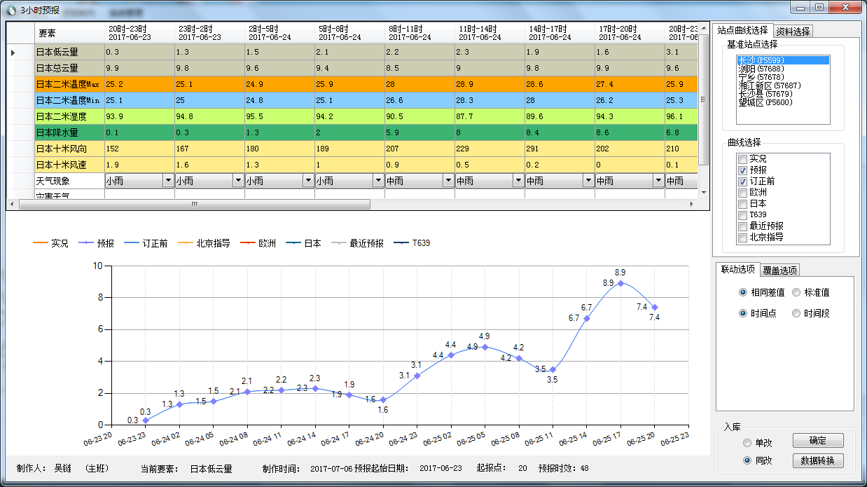 预报制作可基于数值场、客观场资料或其他指导产品,通过地图选择需要分析的精细化预报站点,在功能界面,通过上下联动的数据图表、基准站点选择、数据选择、计算方式选择等,完成本地精细化预报产品的分析制作。